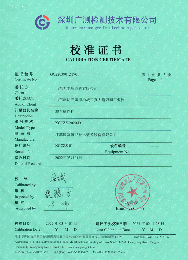 公司3月28日拿到深圳廣測檢測技術有限公司的校準證書
