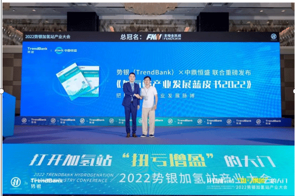會議現場,勢銀(TrendBank)董事長兼CEO 唐蔚波聯合中鼎恒盛氣體設備(蕪湖)有限公司副總經理 楊瑞杰隆重發布《加氫站產業發展藍皮書2022》